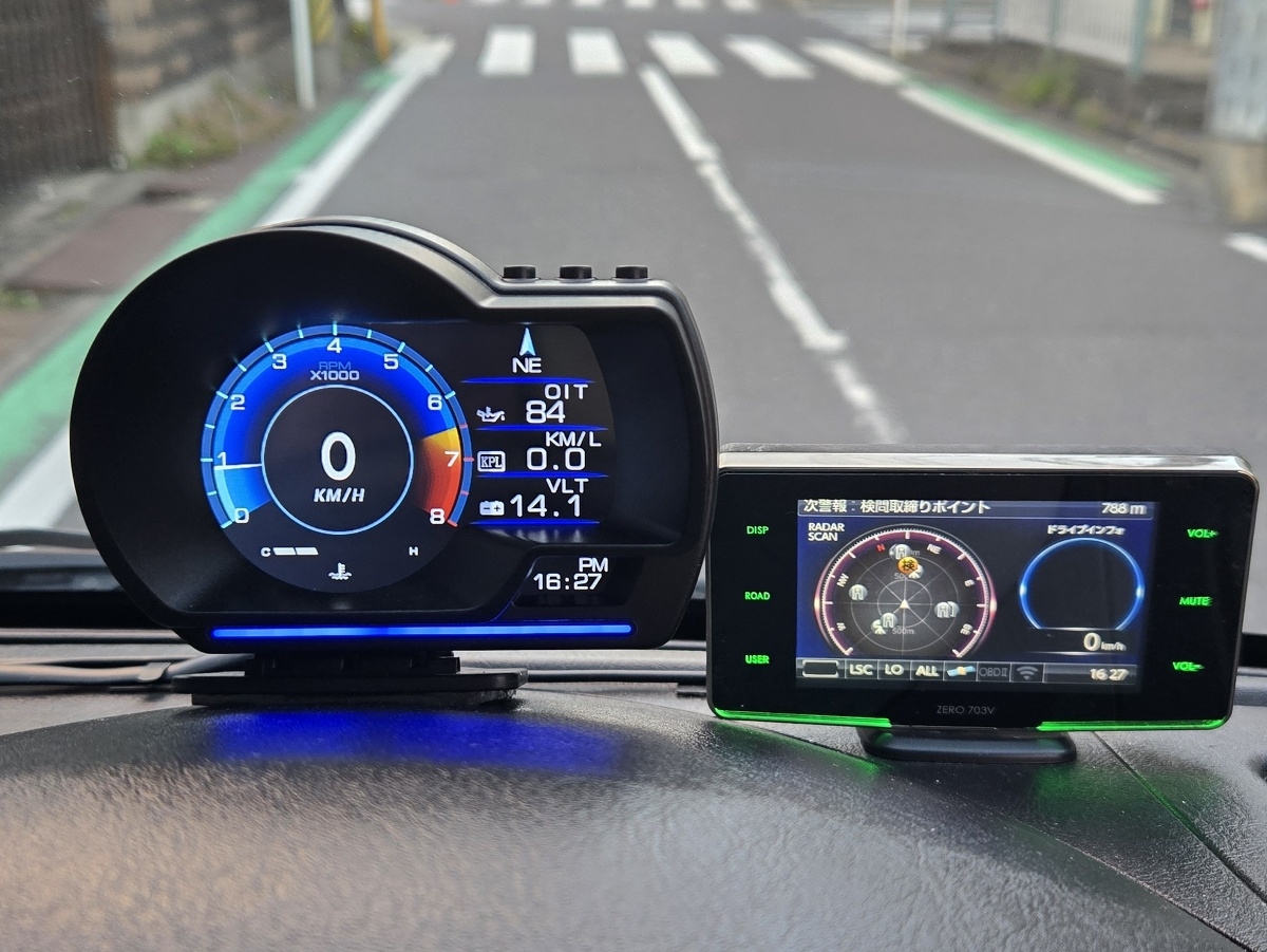 ダッシュボードの上に取り付けすると、目線をほとんど動かさずにスピードが見れてとっても楽! 更にRPM,、油温、水温、電圧、瞬間燃費イマドキのクルマのインパネ周りくらい充実した情報の数々 なんとなく運転するより楽しくなりますよ!