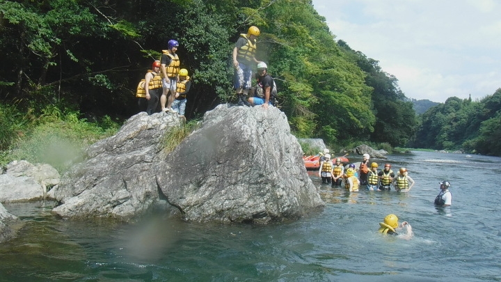 川の上流は流れが速いので、かなり怖かった。みんなでタイミング